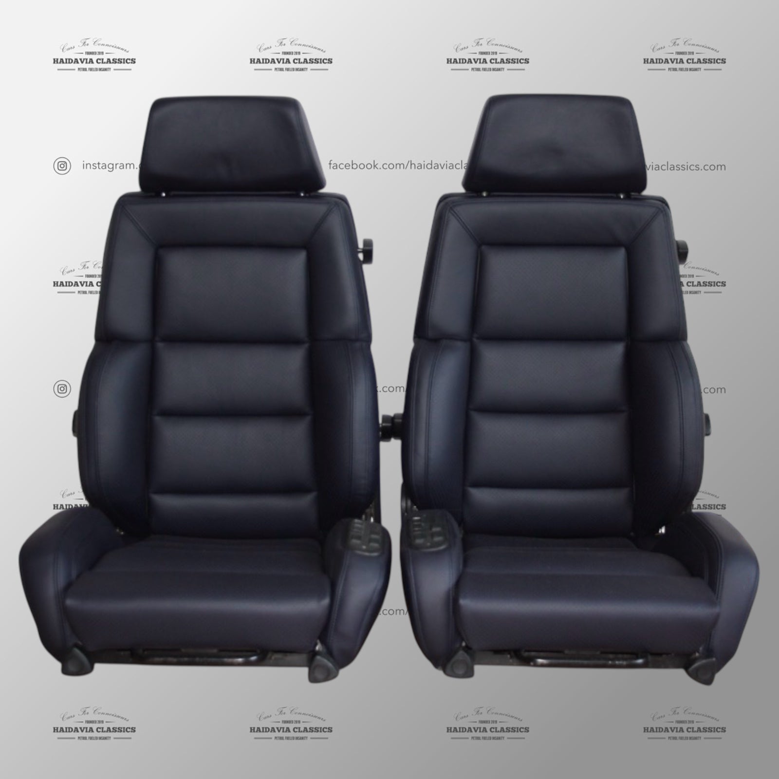 This listing is for a complete pair: one left-hand (driver side) and one right-hand (passenger side) seat, originally designed for sedan or station wagon configurations. In countries where driving occurs on the left side of the road, the left seat would function as the passenger seat.