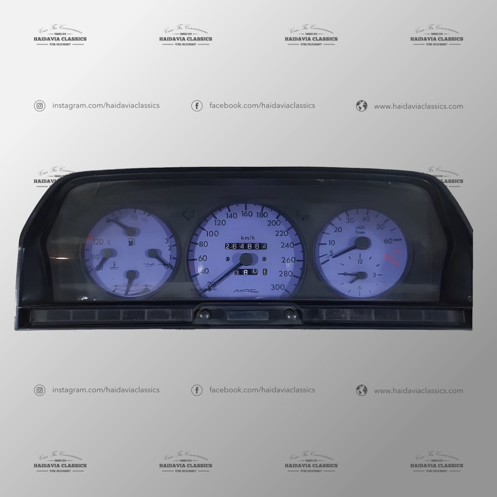 The Mercedes-Benz W201 MAE speedometer, with a range up to 300 km/h, is a rare and exceptional component tailored for the discerning enthusiast. The MAE speedometer for the W201 often accompanies high-performance modifications and reflects the unique character of each customized vehicle. These speedometers, with their bespoke gauge faces and enhanced illumination, offer a perfect blend of functionality and style, making them a prized addition for any classic Mercedes-Benz aficionado.