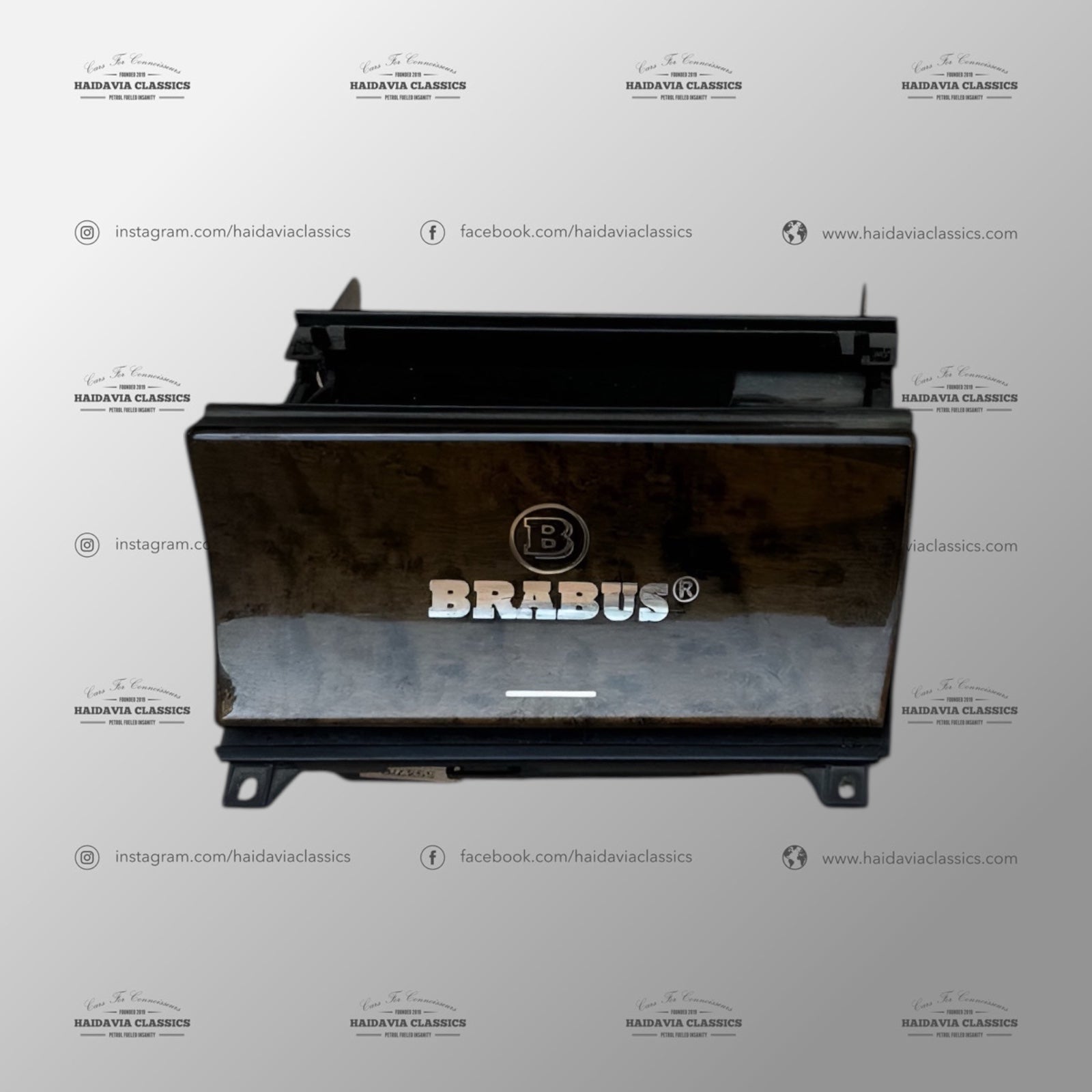 A genuine BRABUS middle console ashtray in good condition, finished in high-quality wood veneer and featuring authentic BRABUS branding.