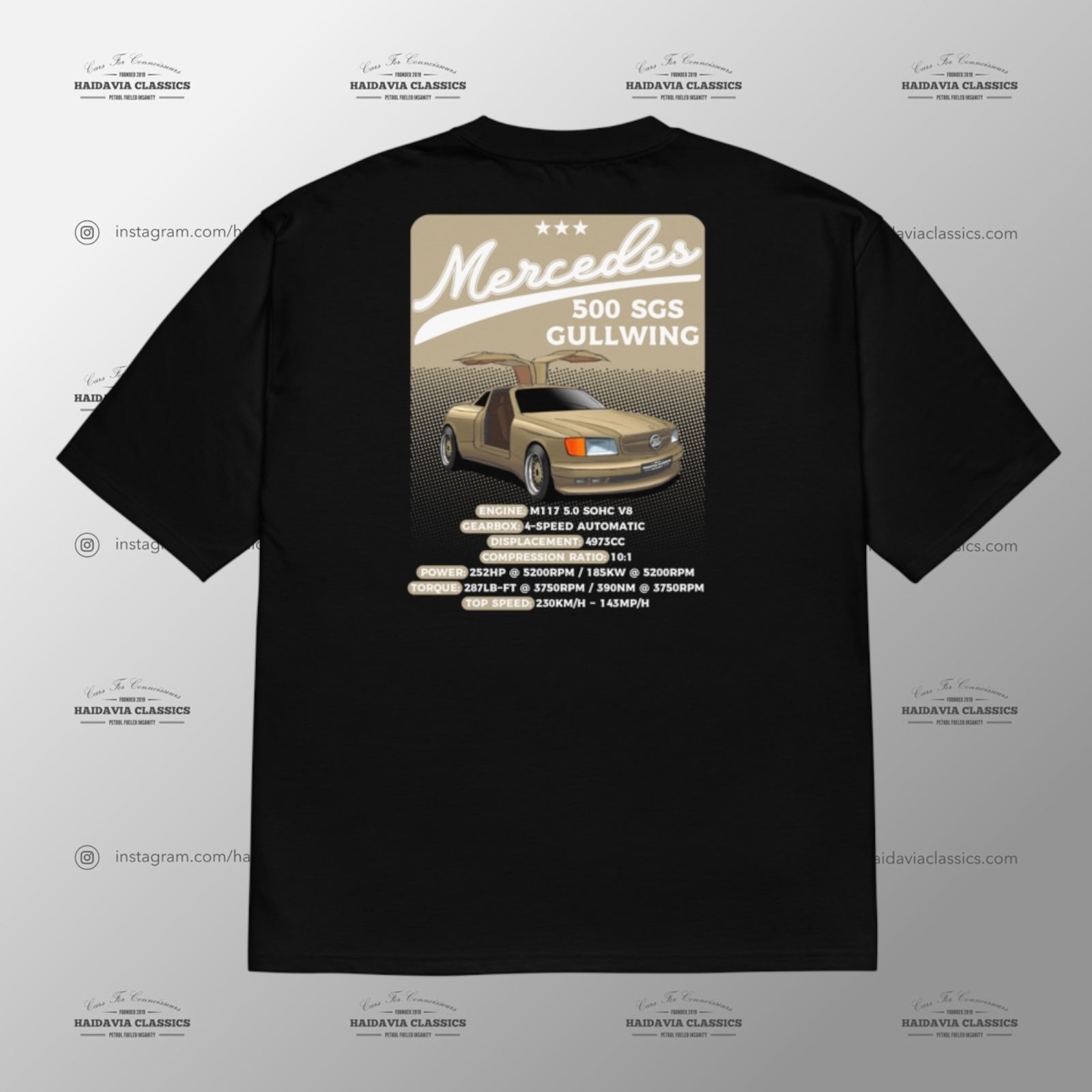 The 500 SGS Gullwing paid homage to the iconic and timeless design of the original 300SL Gullwing, capturing the essence of automotive history and elegance. Crafted by the visionary mind of Chris Hahn at Styling Garage (SGS), this masterpiece embodied the spirit of the classic Gullwing while adding its own unique touches. With only 57 examples ever produced, the 500 SGS Gullwing became a rare and cherished gem. Celebrate the fusion of heritage and innovation with this t-shirt that displays the allure and legacy of the 500 SGS Gullwing.