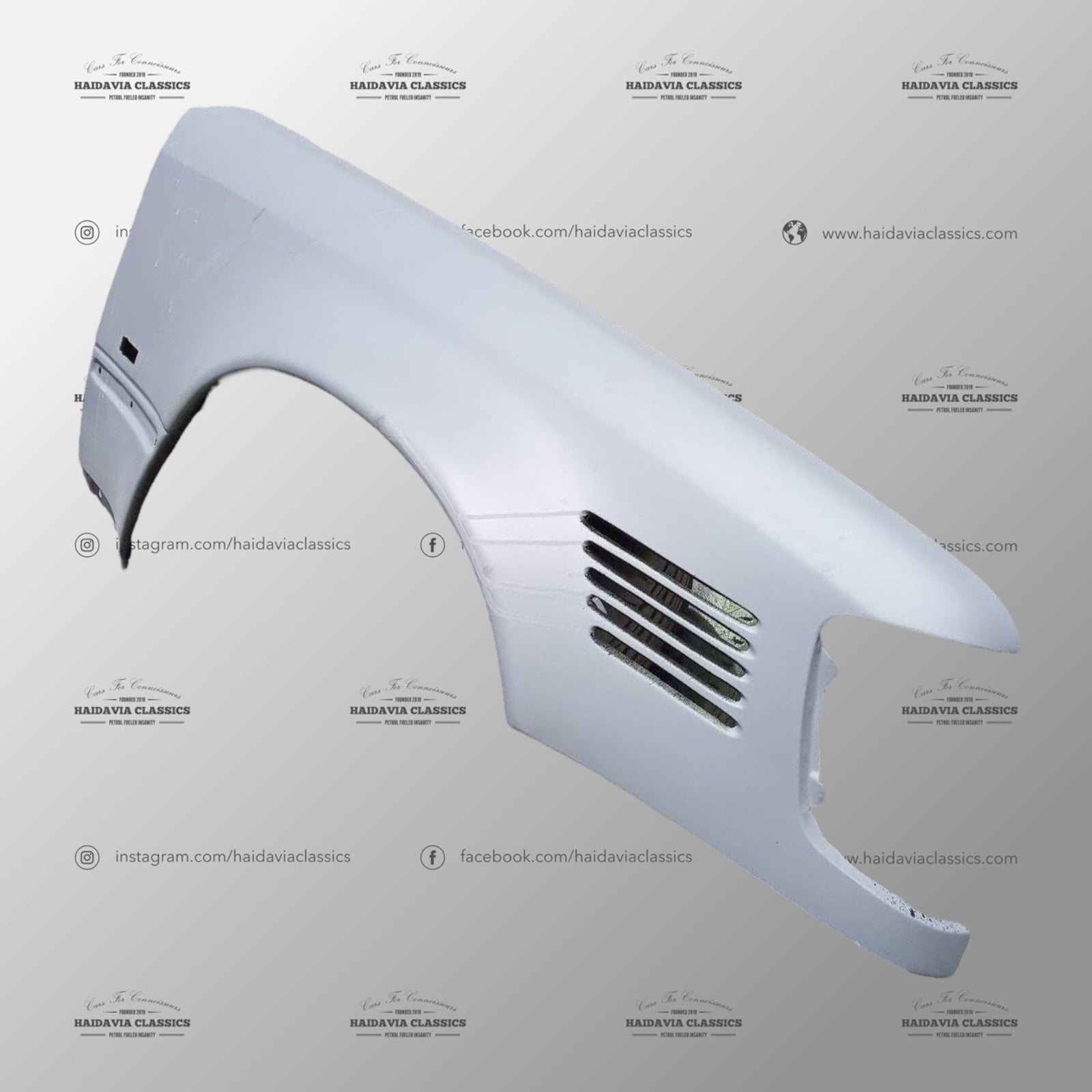 A high-quality reproduction pair of Mercedes-Benz W124 E500 front fenders, crafted in metal for an authentic fit and finish. These fenders replicate the widebody design that set the E500 apart, while also featuring the distinctive turbo cut-out vent for improved airflow and performance styling.